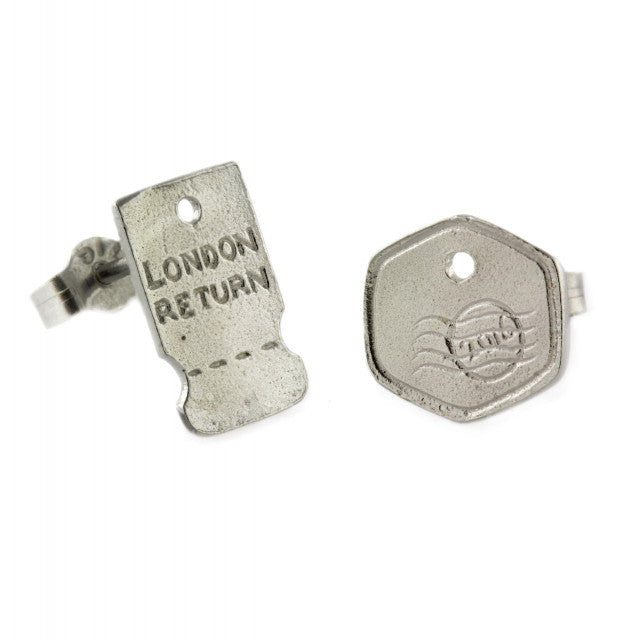 A pair of asymmetric luggage tag stud earrings, hand-engraved with "London Return" on one and the other with a date stamp in relief.