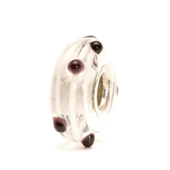 A white ribbon coils itself around clear glass with small black dots floating on the surface. A very stylish and elegant Trollbead.