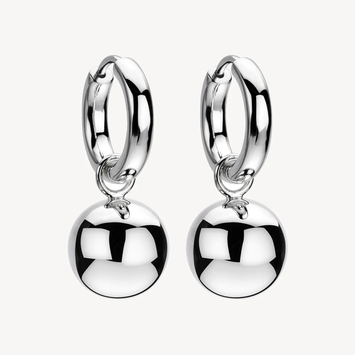 The smooth surfaces of spheres are said to keep the energy flow moving. To ensure yours flows with elegance, our master silversmiths have polished spherical charms and suspended them from contemporary huggies. For a different gorgeous look, slip off the charms and let your huggies do the style talking.