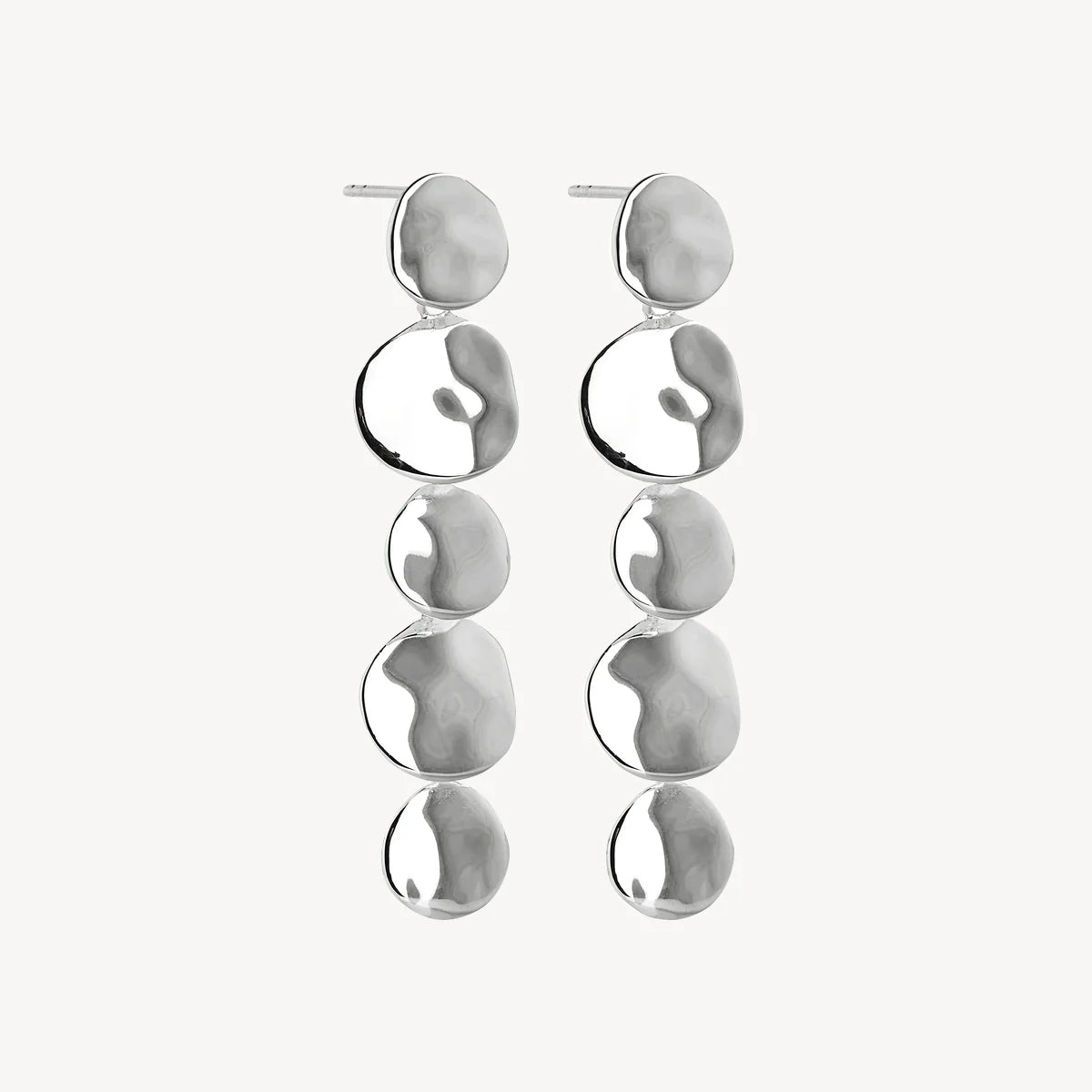 The hypnotic aura of flowing water over river pebbles is expertly captured in these eternally feminine earrings. Our master silversmiths handcraft each of the five sterling silver pebbles and link them to evoke a cascading flow. The pebbles are organic in shape to diffuse the light and flattened to make them lighter for all-day comfort.