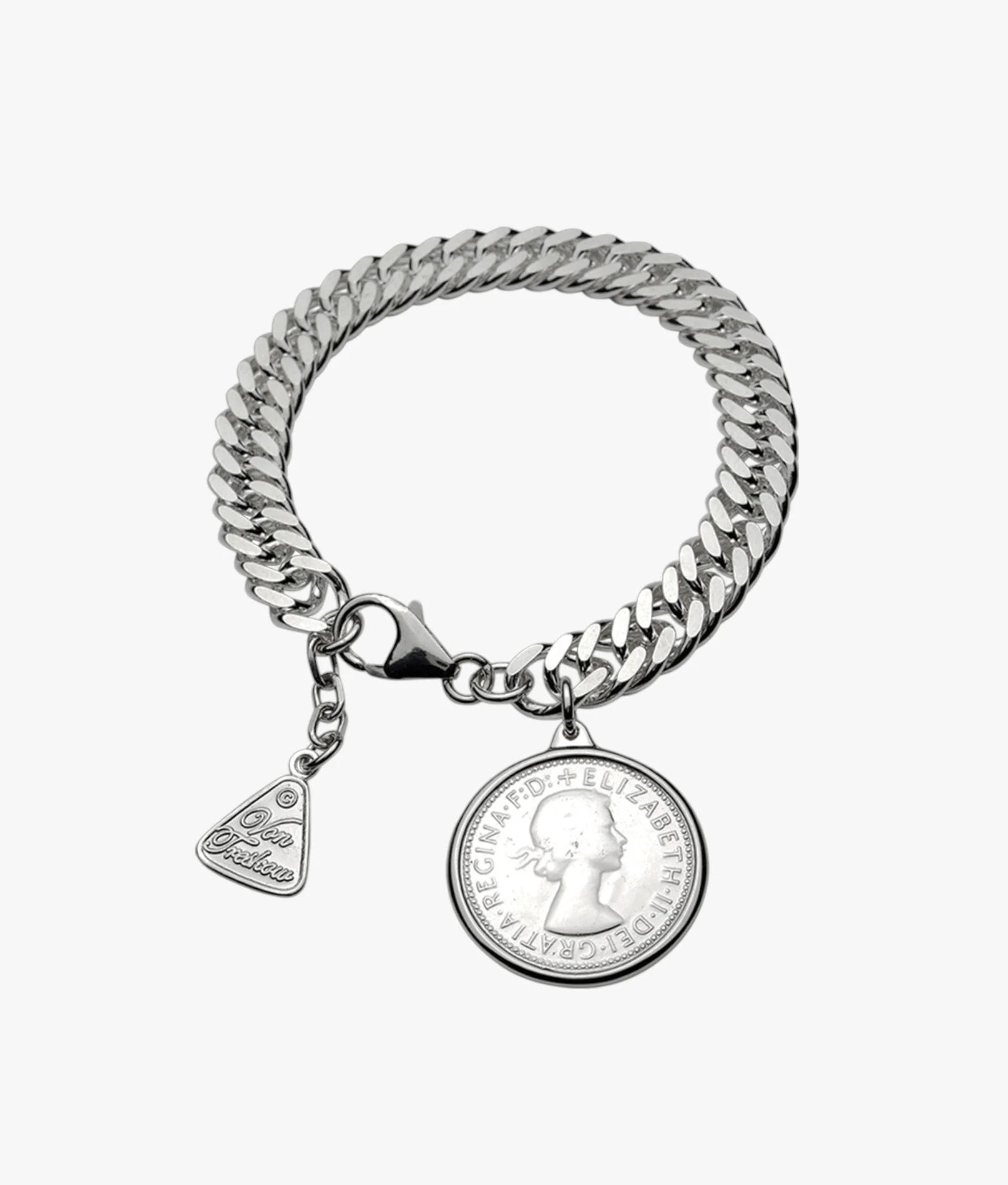 The condensed curb bracelet features tightly connected curb links, creating a sleek & modern look. This pieces features an authentic Australian shilling coin encased in sterling silver.