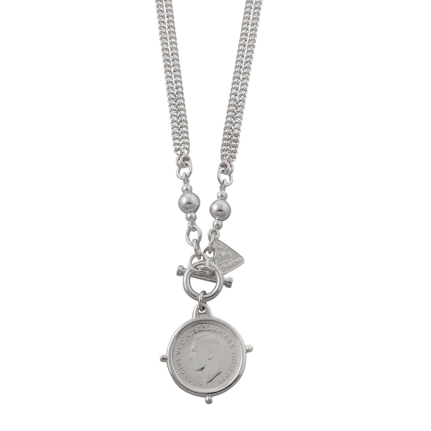 The fine double layered curb chain necklace with authentic Australian sixpence coin. This piece can be worn short at 45cm when the chain is doubled together, or opened up to be worn long at 90cm.