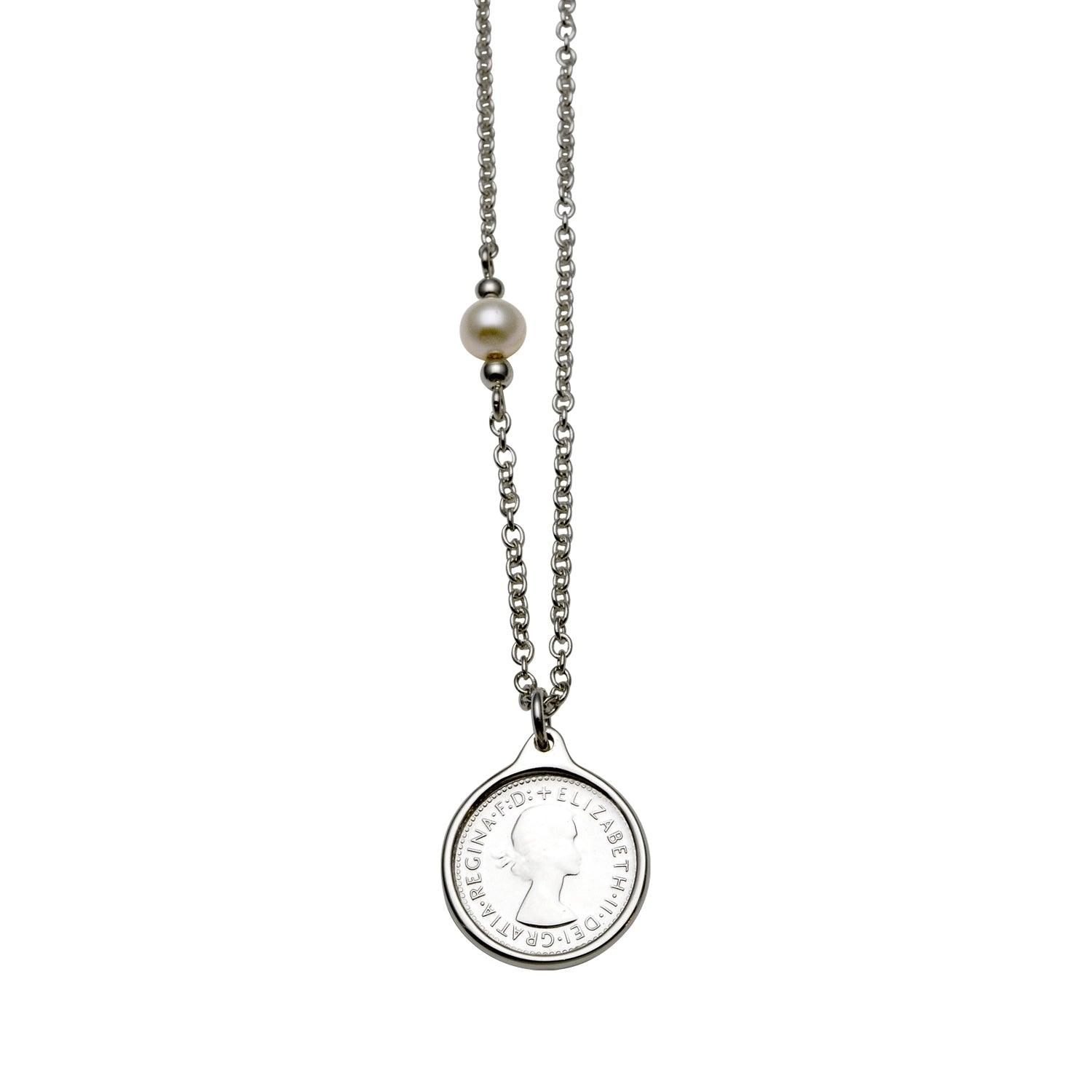 Name chain necklace with freshwater pearl and authentic Australian threepence coin.
